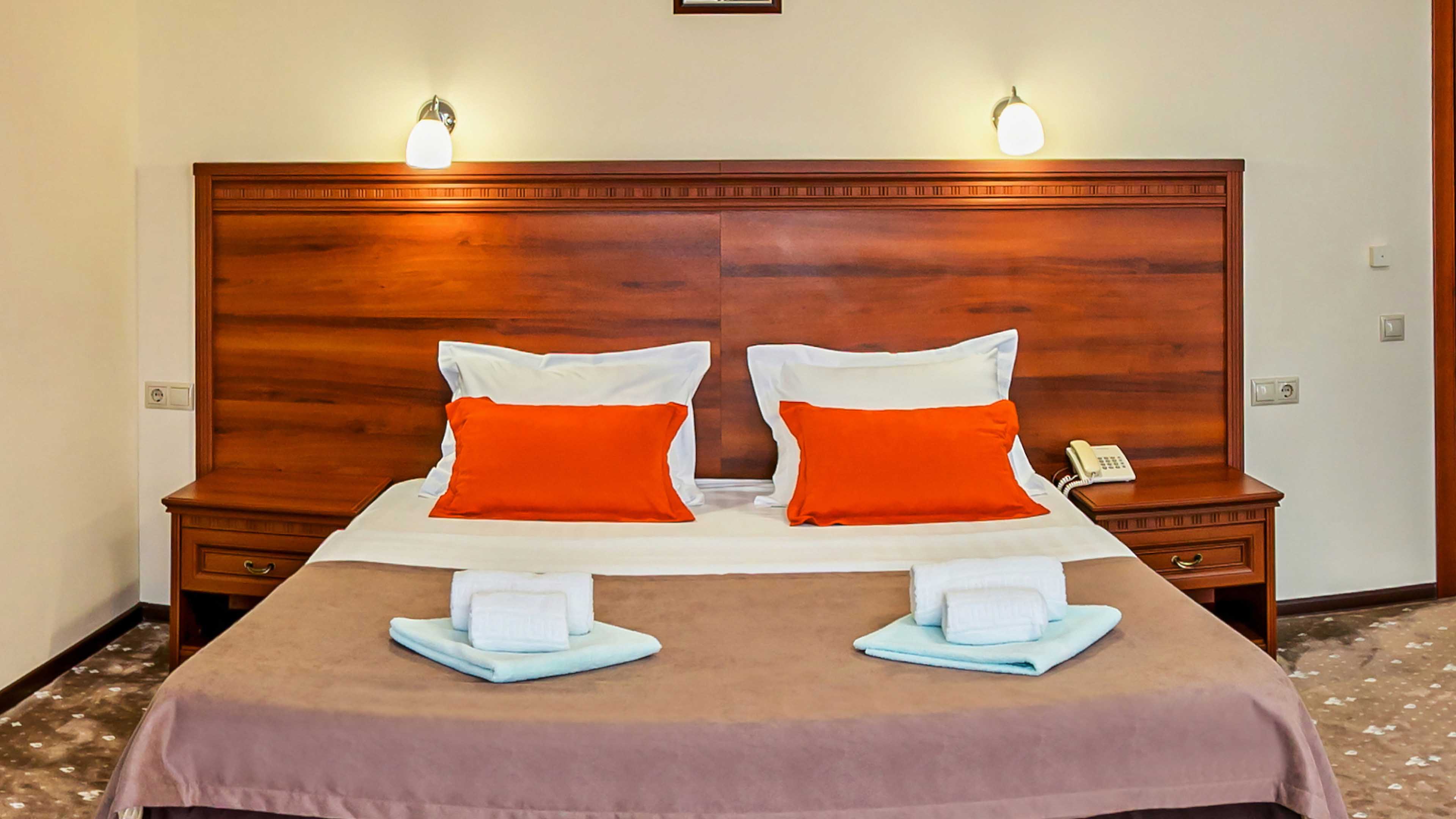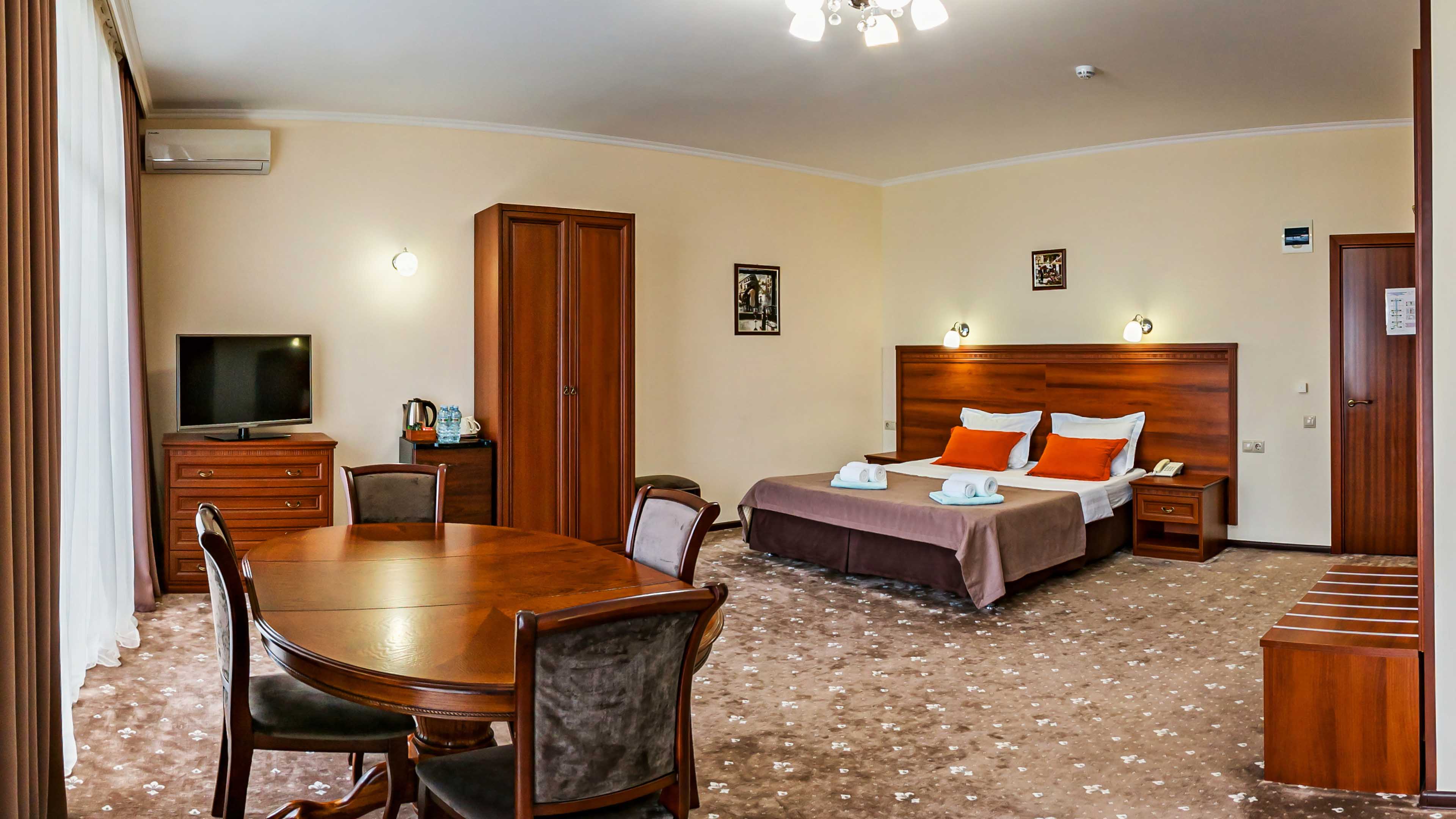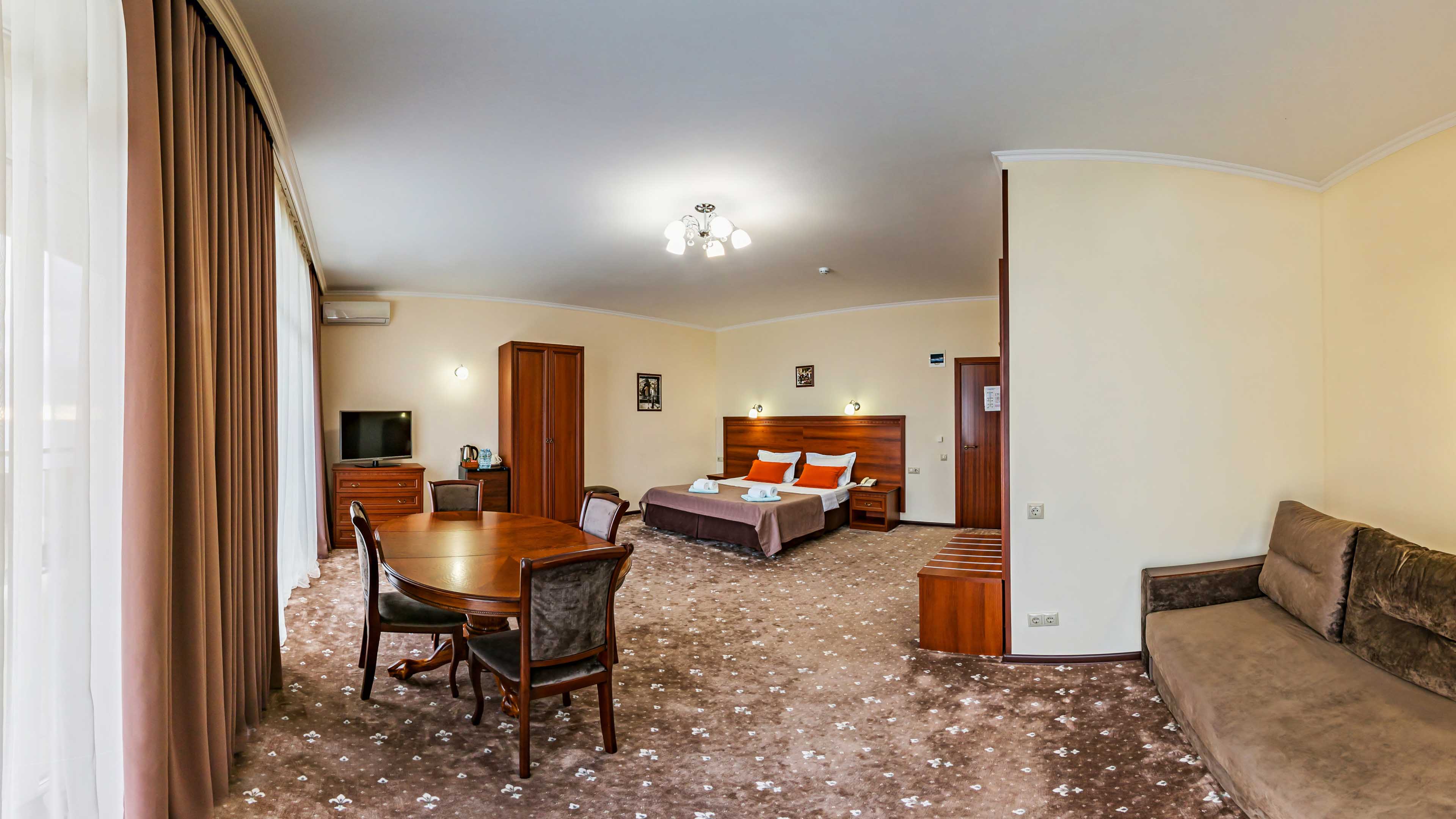 Просторный однокомнатный номер Люкс (Студия) , с повышенным уровнем комфорта и возможностью размещения до 5 человек. В каждом номере Люкс просторная комната и ванная со всеми необходимыми косметическими принадлежностями, а так же балкон с мебелью. Этот стильный и по-домашнему уютный номер оснащен всем самым необходимым и полностью соответствует требованиям наших гостей. Все условия для Вашего отдыха. По желанию в номер может быть установлена дополнительная кровать для ребёнка или взрослого (оплачивается по дополнительному тарифу) |