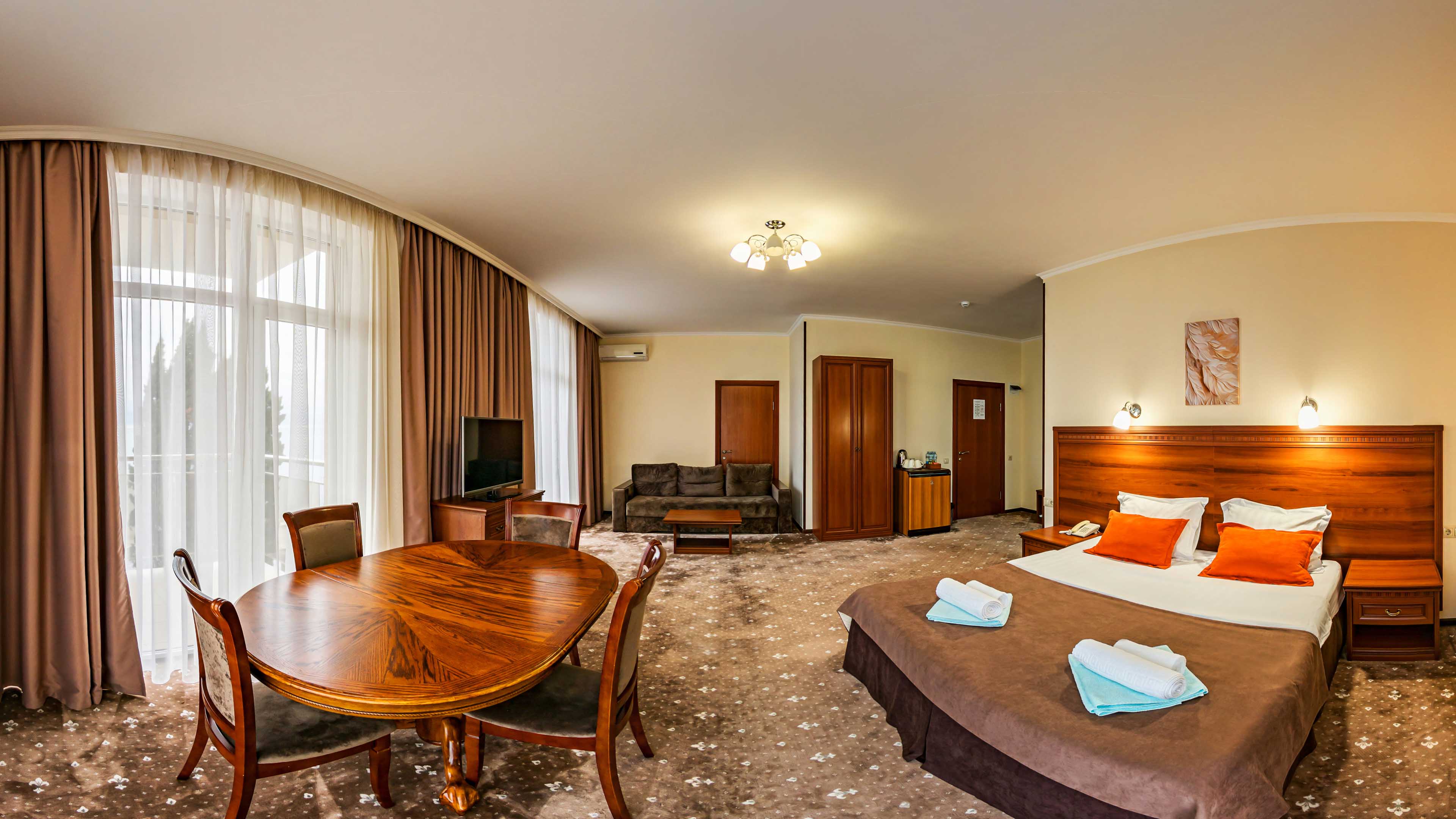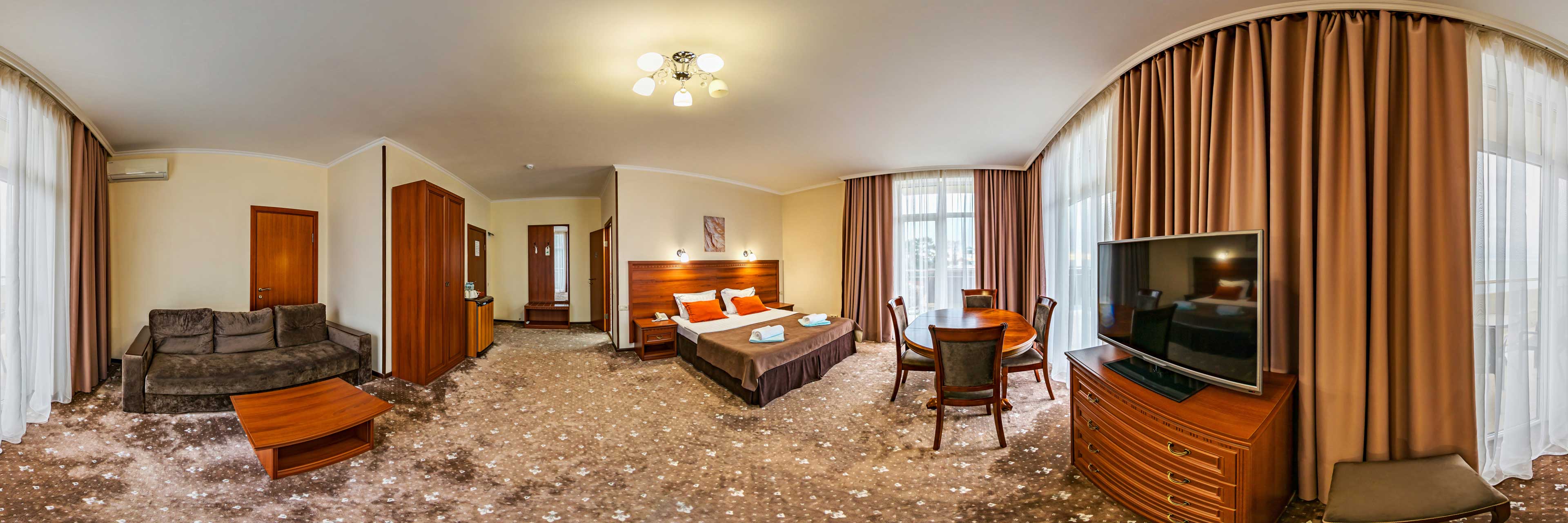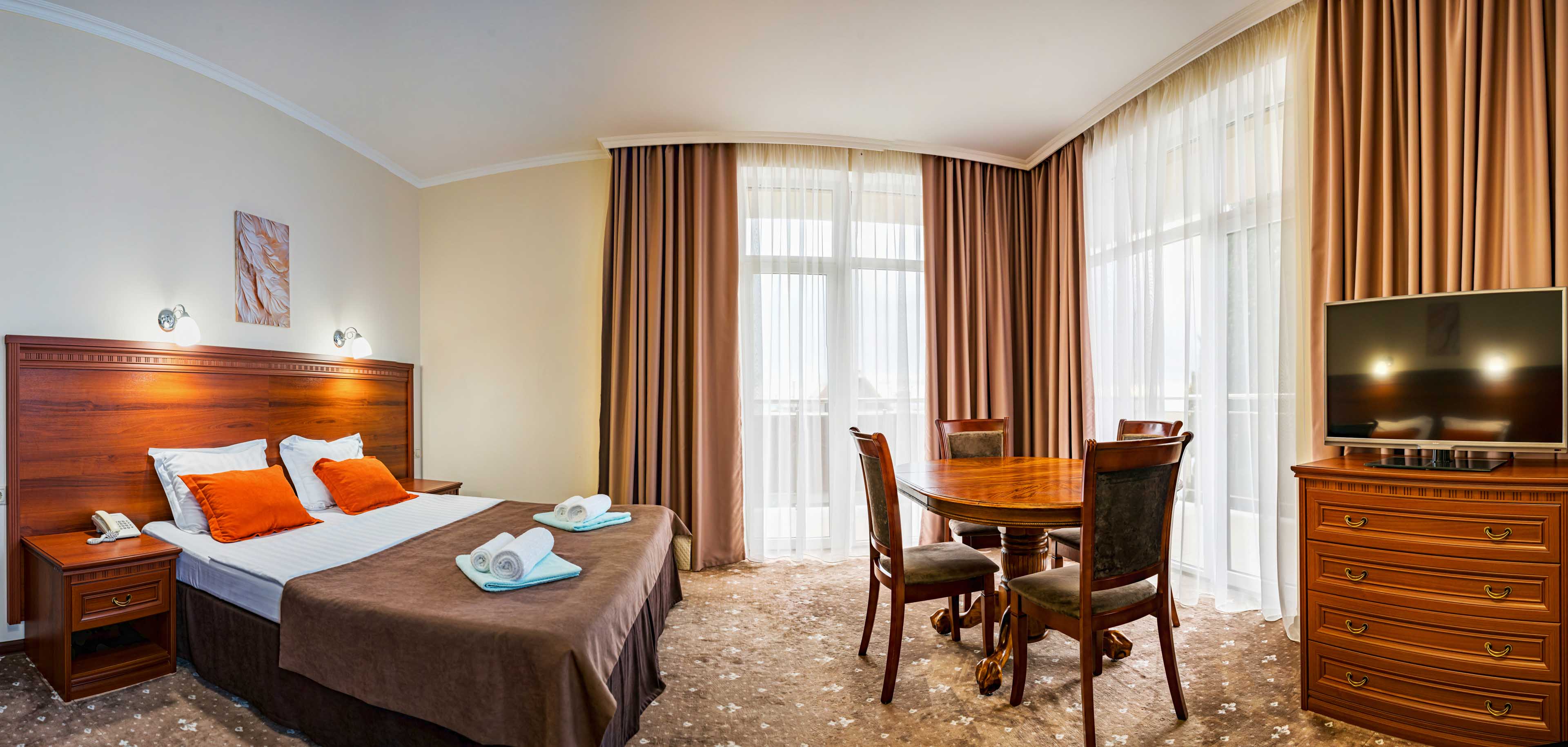 Просторный однокомнатный номер Люкс (Студия) , с повышенным уровнем комфорта и возможностью размещения до 5 человек. В каждом номере Люкс просторная комната и ванная со всеми необходимыми косметическими принадлежностями, а так же балкон с мебелью. Этот стильный и по-домашнему уютный номер оснащен всем самым необходимым и полностью соответствует требованиям наших гостей. Все условия для Вашего отдыха. По желанию в номер может быть установлена дополнительная кровать для ребёнка или взрослого (оплачивается по дополнительному тарифу) |