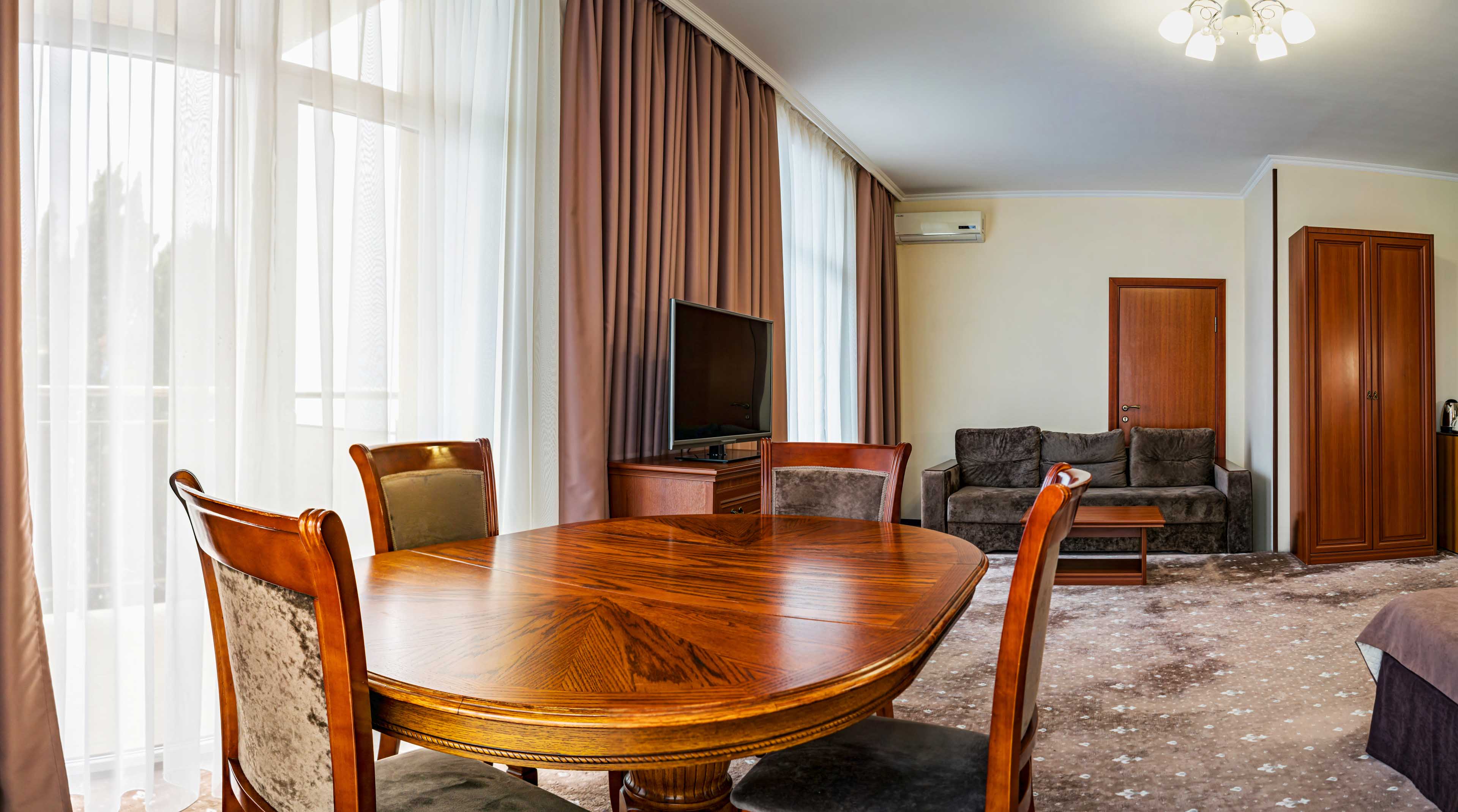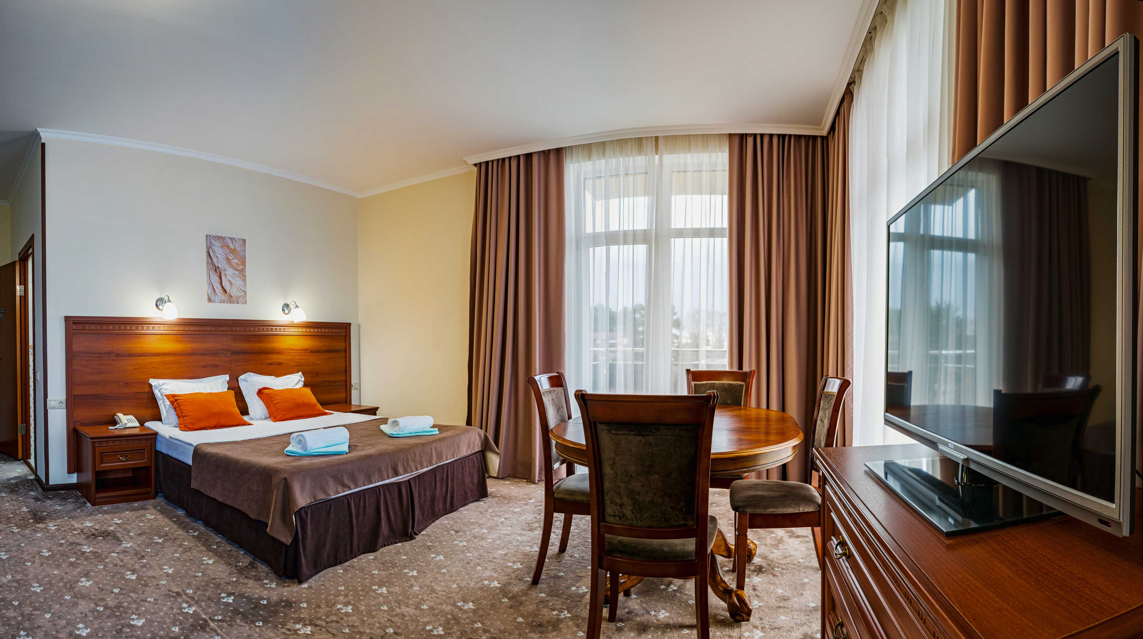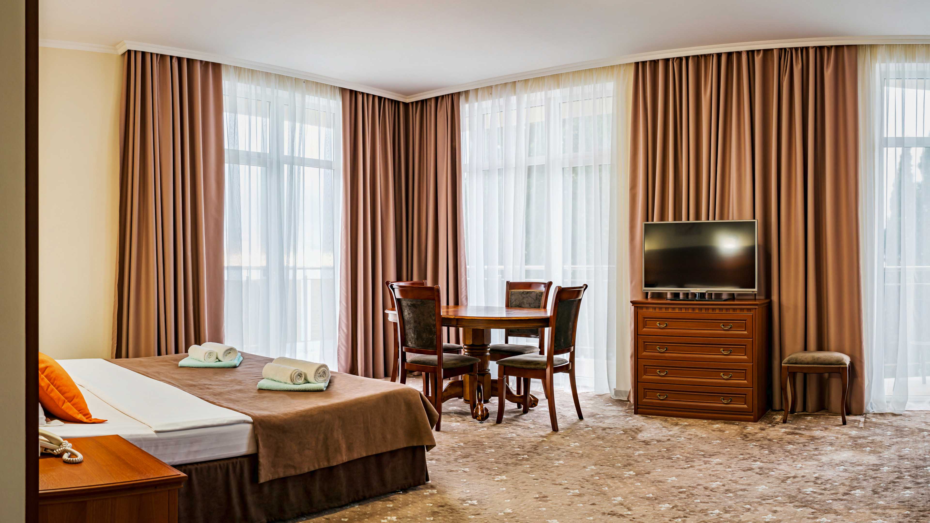 Просторный однокомнатный номер Люкс (Студия) , с повышенным уровнем комфорта и возможностью размещения до 5 человек. В каждом номере Люкс просторная комната и ванная со всеми необходимыми косметическими принадлежностями, а так же балкон с мебелью. Этот стильный и по-домашнему уютный номер оснащен всем самым необходимым и полностью соответствует требованиям наших гостей. Все условия для Вашего отдыха. По желанию в номер может быть установлена дополнительная кровать для ребёнка или взрослого (оплачивается по дополнительному тарифу) |