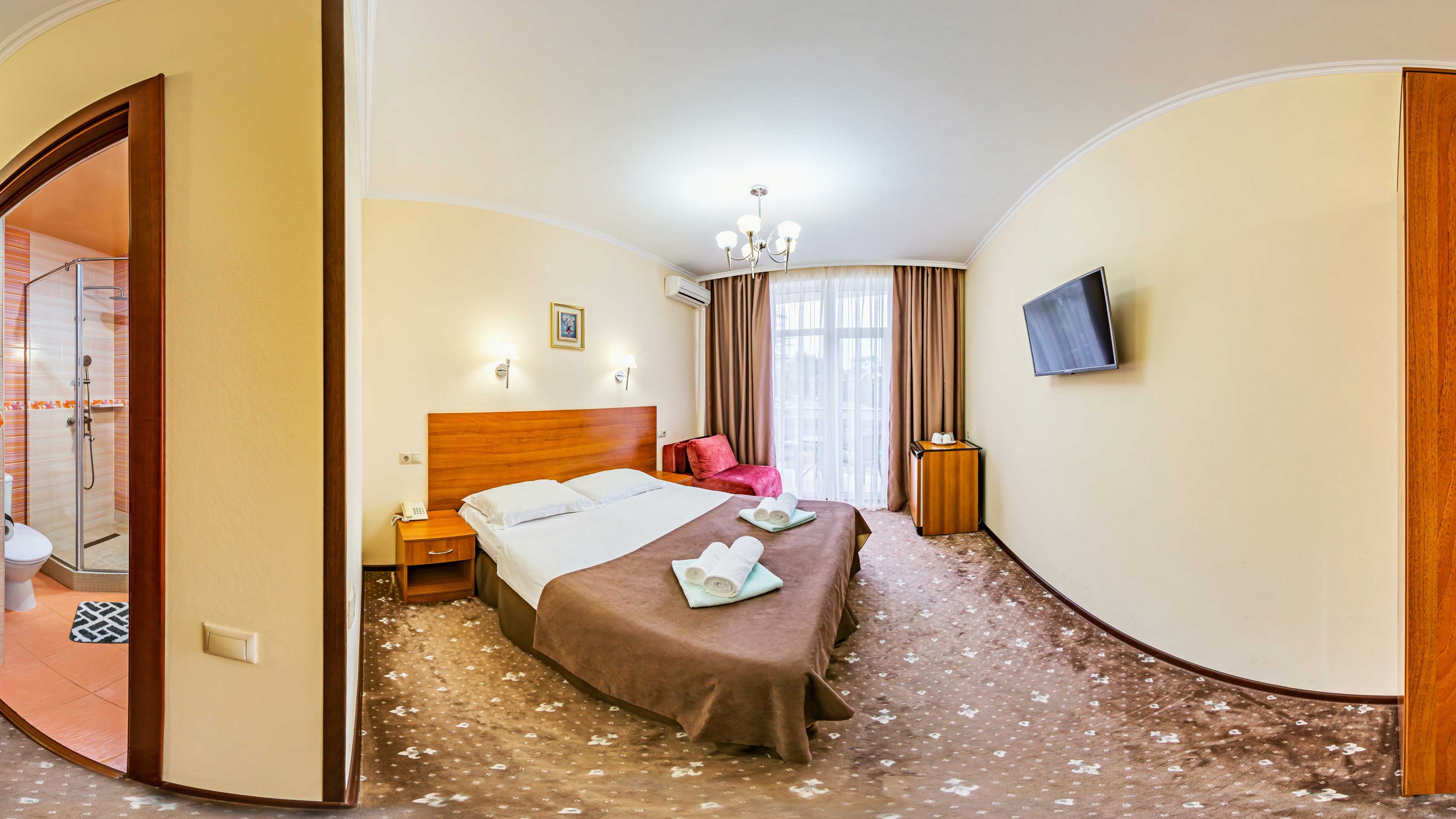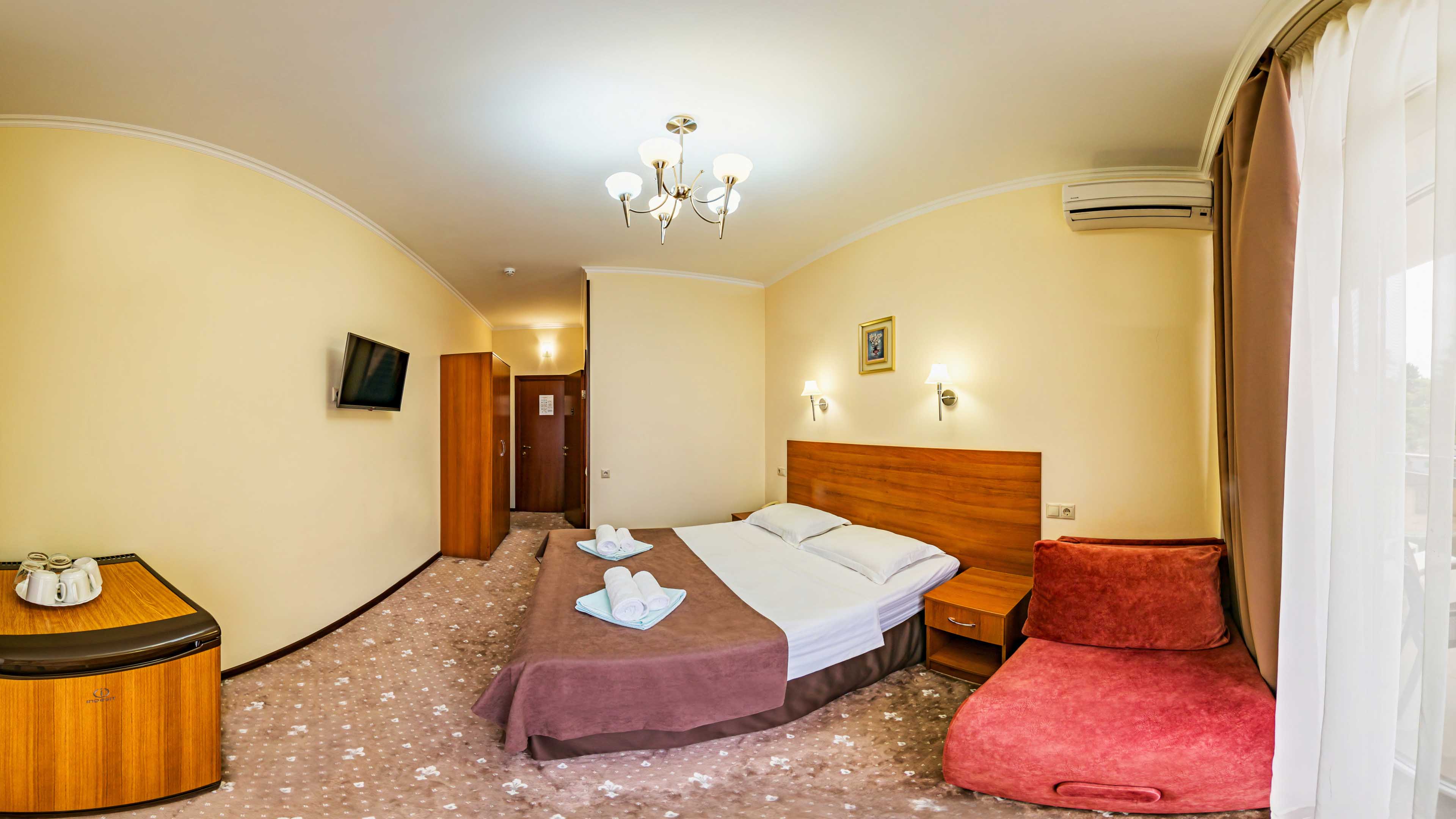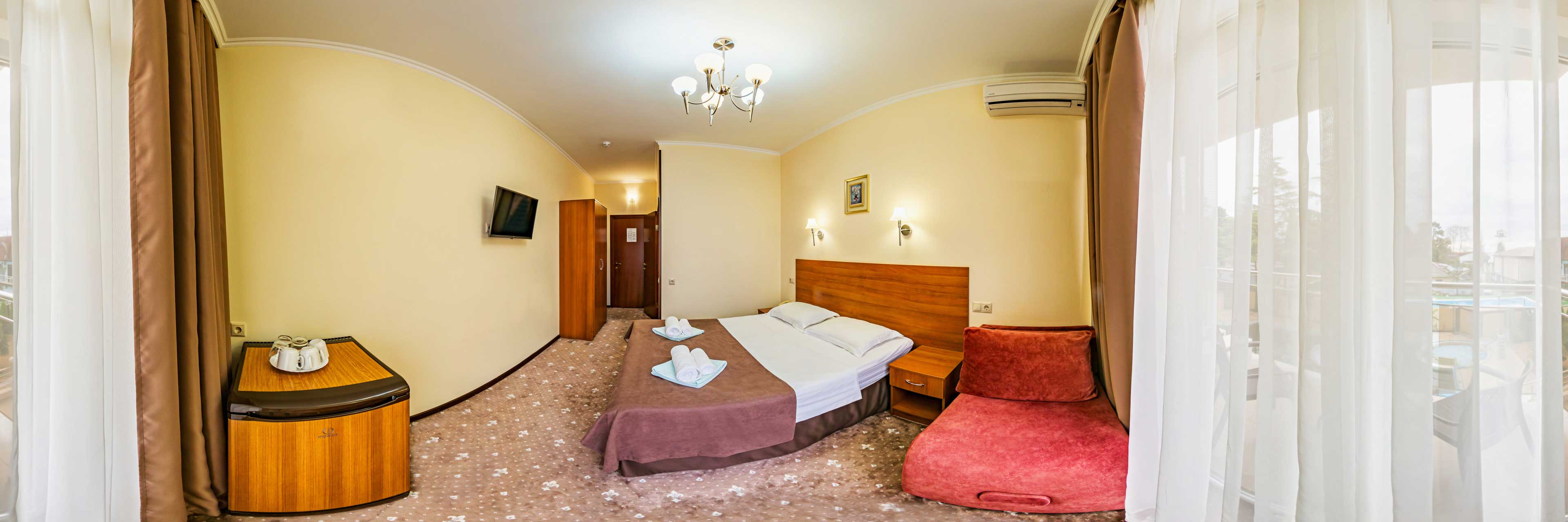 3х-местный однокомнатный "Вид на Бассейн" с балконом 3 этаж (22 кв.м.) В каждом номере: - мебель (кровати две одноместные/одна двухместная, прикроватные тумбочки, шкаф, балконная мебель) - телевизор - кондиционер - холодильник - посуда (тарелка, стаканы) - сейф - санузел, фен, полотенца, сушилка для белья - балкон по желанию в номер может быть установлена дополнительная кровать для ребёнка или взрослого (оплачивается по дополнительному тарифу) |