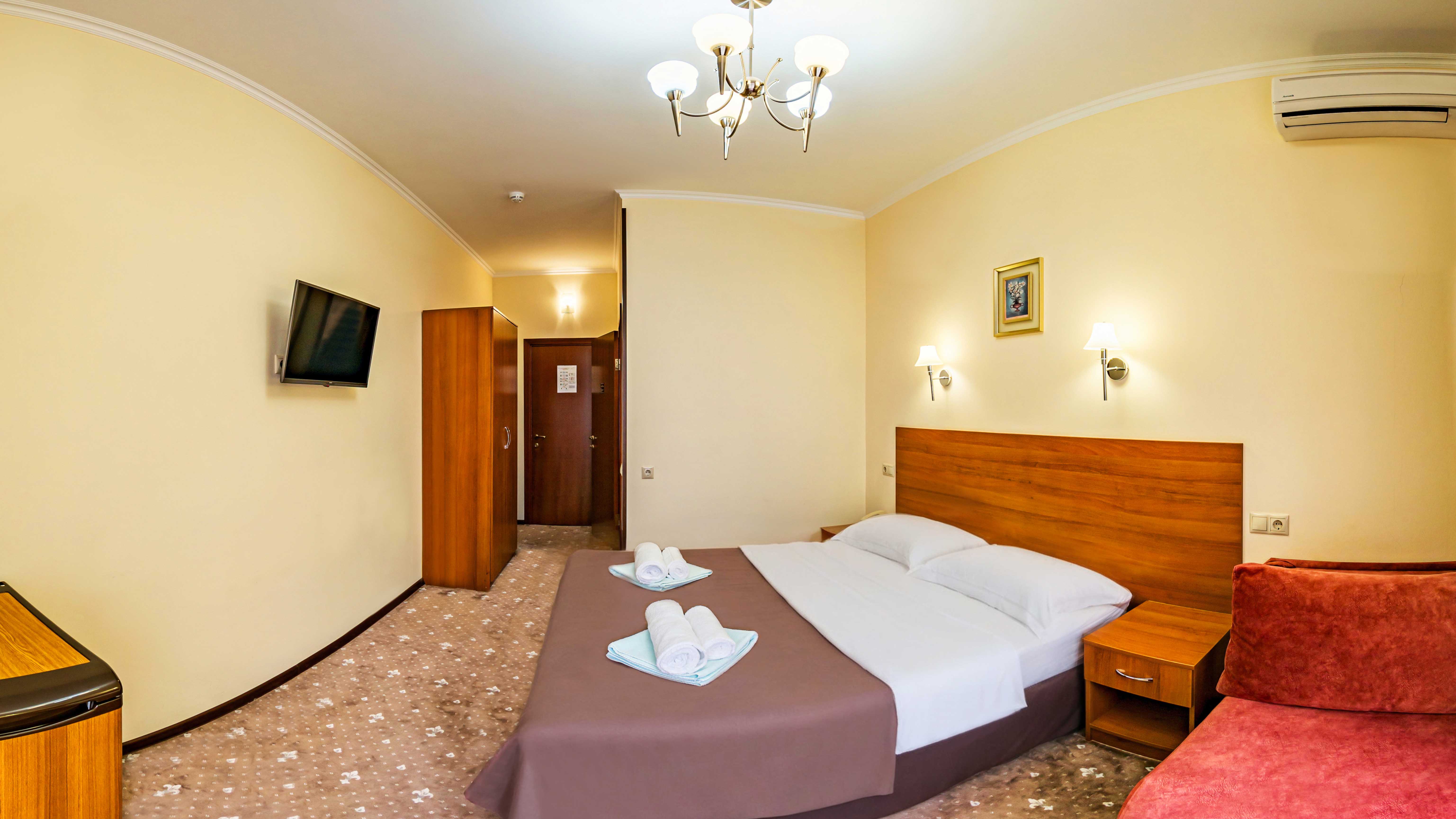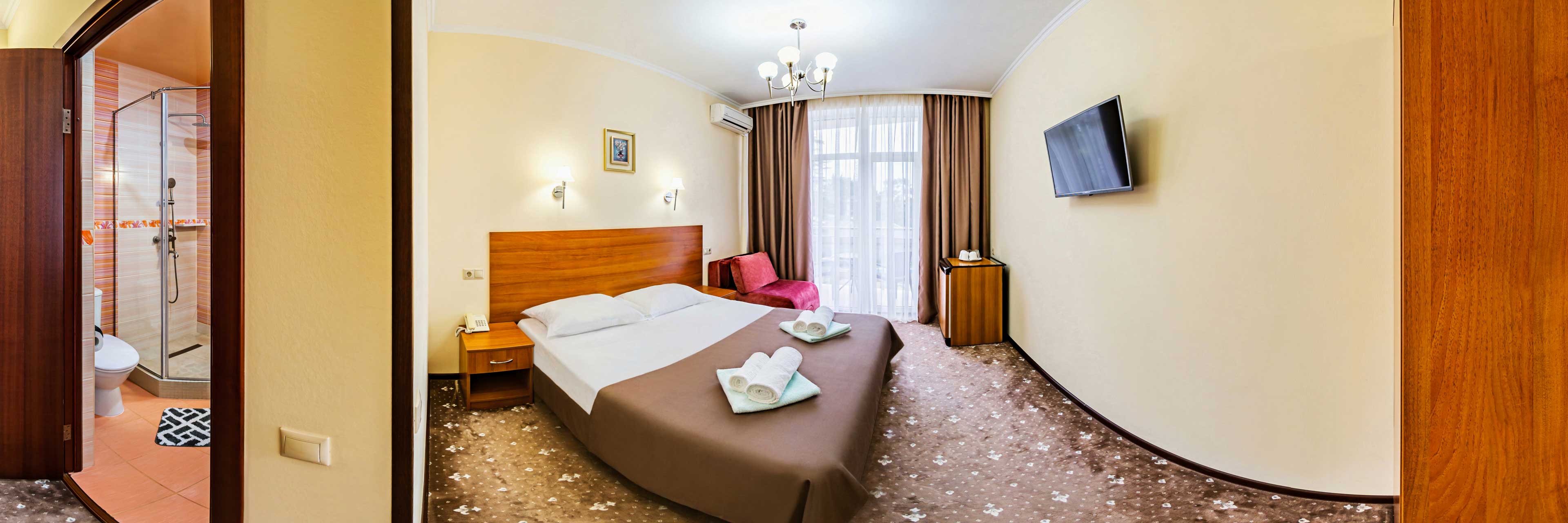 3х-местный однокомнатный "Вид на Море" с балконом 4 этаж (22 кв.м.) В каждой комнате: - мебель (кровати две одноместные/одна двухместная, прикроватные тумбочки, шкаф, балконная мебель) - телевизор - кондиционер - холодильник - посуда (тарелка, стаканы) - сейф - санузел, фен, полотенца, сушилка для белья - балкон по желанию в комнату может быть установлена дополнительная кровать для ребёнка или взрослого (оплачивается по дополнительному тарифу) |